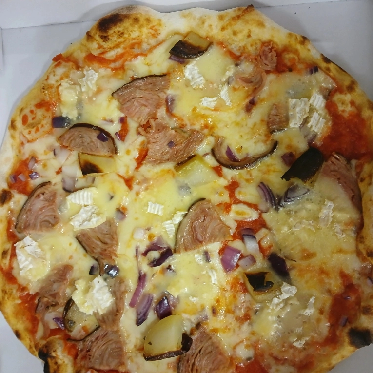 Base moutardée, mozzarella, oignons rouges, pommes de terre, andouille de Guémené, camembert d’Eugénie
