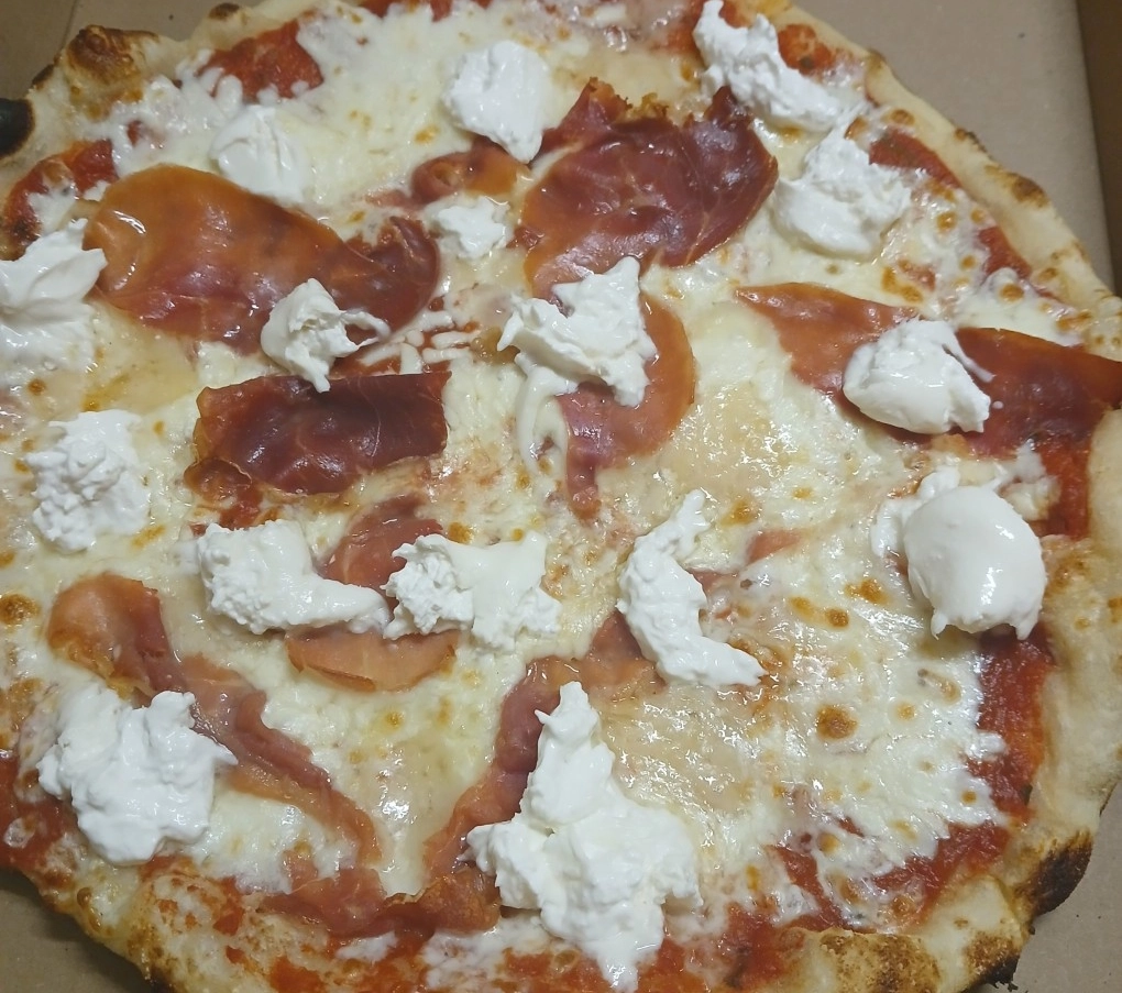 Base crème, mozzarella, reblochon, oignons rouges, pommes de terre, jambon sec