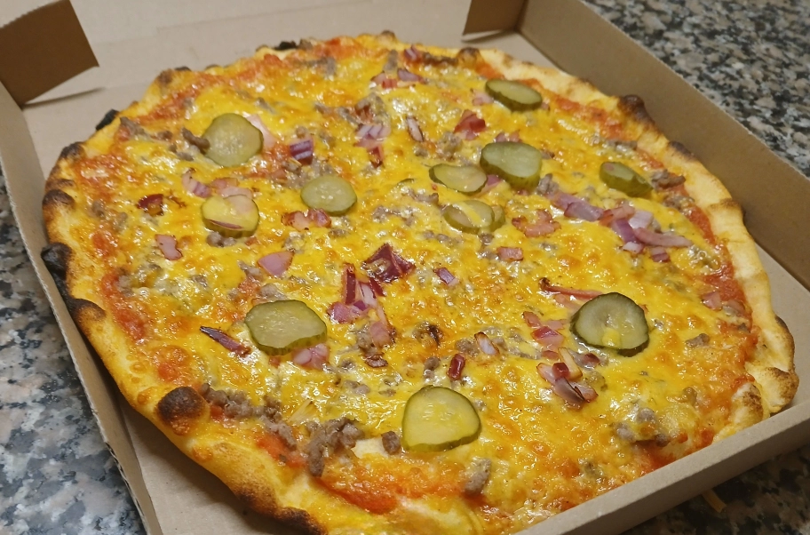 Base tomate, cheddar, bœuf hâché, oignons rouges, sauce burger, cornichons