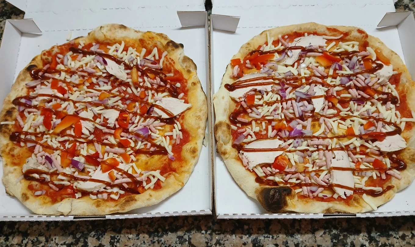 Base crème, mozzarella, oignons rouges, poivrons, poulet rôti, sauce curry, olives, origan